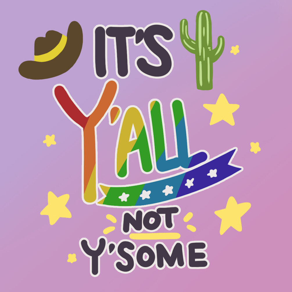 a 2"2 sticker with the saying "it's y'all not y'some" with stars, a cowboy hat, and a cactus surrounding the words. proceeds will be donated to the Equality Federation (https://www.equalityfederation.org/about/).